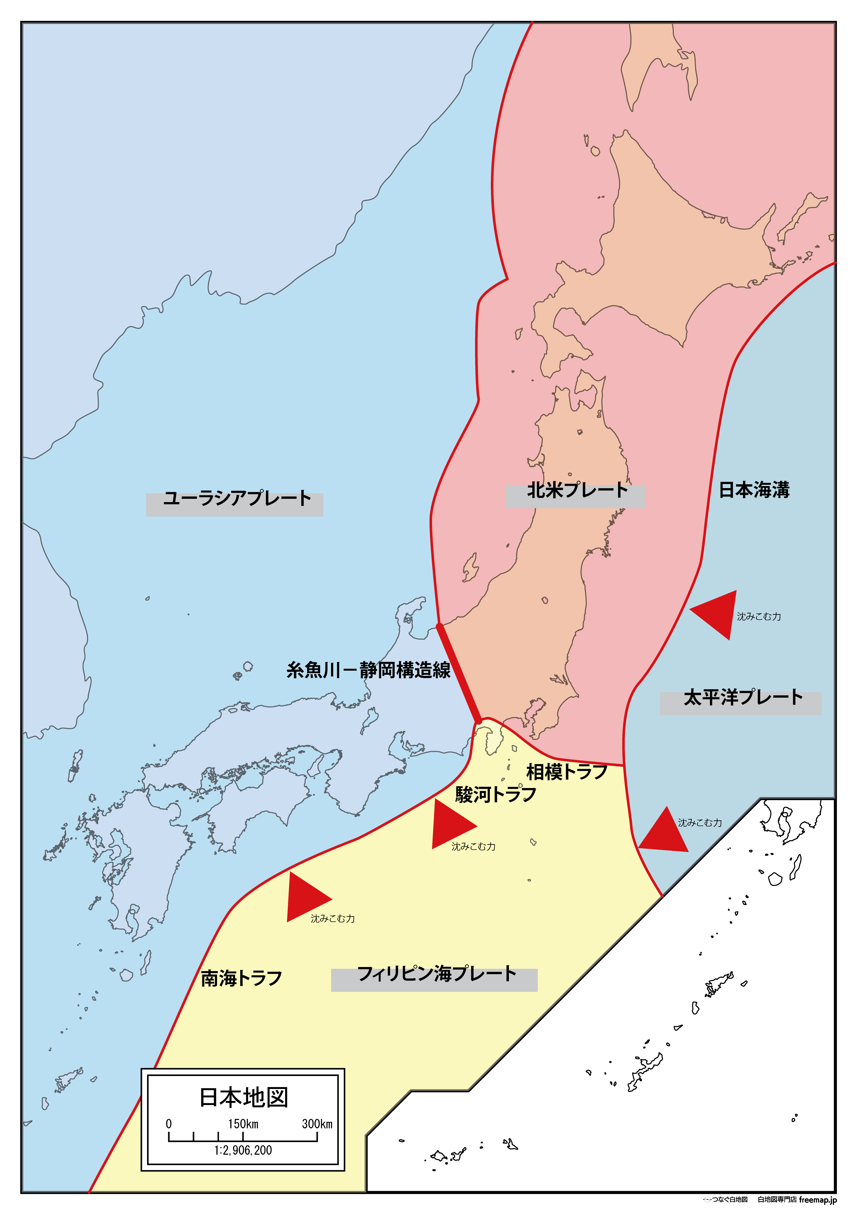 - ユーラシアプレート(西南日本を乗せている)